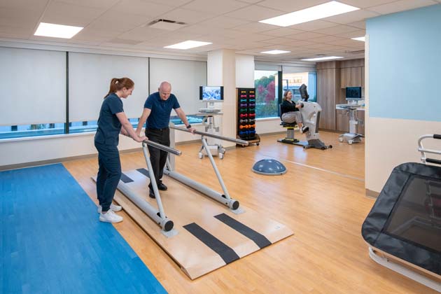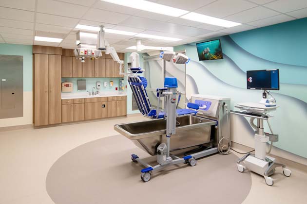 Clinical spaces were created with flexibility in mind, while still adhering to strict infection control standards. The tub and procedure rooms, which are equipped to support general anesthesia, also provide access to sterilized water over patient beds. Additionally, the Physical Therapy room flexes to offer ample space for both inpatient and outpatient care.