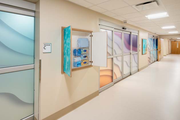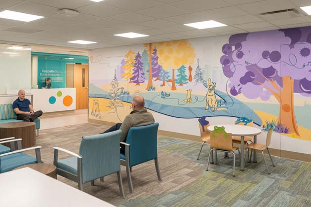 The Hasenstab team worked with clinical staff to create a comforting, healing space. Outside views, natural light, and calming colors contribute to an environment with plenty of positive distractions to aid patients in their long and often painful journeys to recovery.
