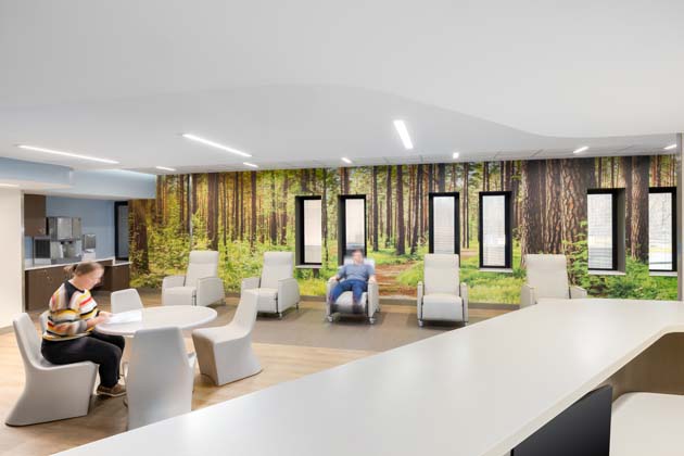 Safety and serenity were guiding principles throughout the design. Open nurse stations and ligature-resistant fixtures safeguard both patients and staff, while abundant natural light and calming finishes create an environment that feels restorative rather than clinical. The result is a space that redefines emergency behavioral health care—combining efficiency, safety, and compassion.