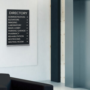 HealthcareSigns.com’s Borderline Sign Collection includes signage for room numbers, suite IDs, common rooms, building directories, restrooms, stairs and elevators, and wayfinding. The collection features a minimalist aesthetic, a variety of layouts, and a two-layer construction with an offset backplate.